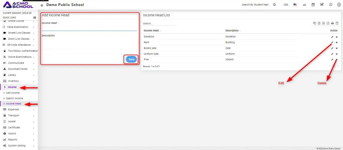 To add income head enter Income Head Name and Description then click on Save button, you can view this added record on the right side in the Income head list.