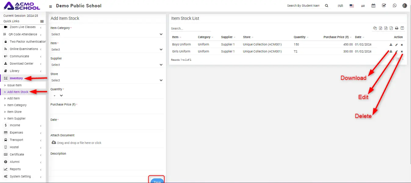 Here select the Item Category, Item, Supplier, Store and fill the other fields and then click on Save button