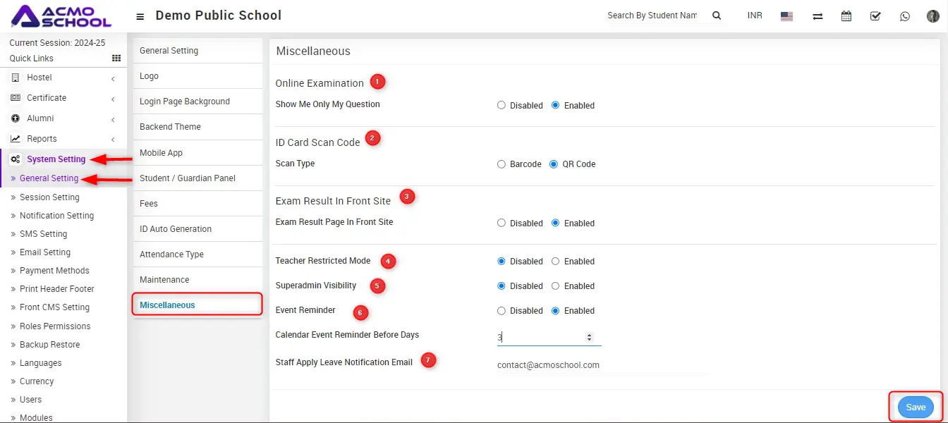 In superadmin visibility setting, superadmin can show and hide his / her name in any Demo Public school module where name of superadmin displaying.