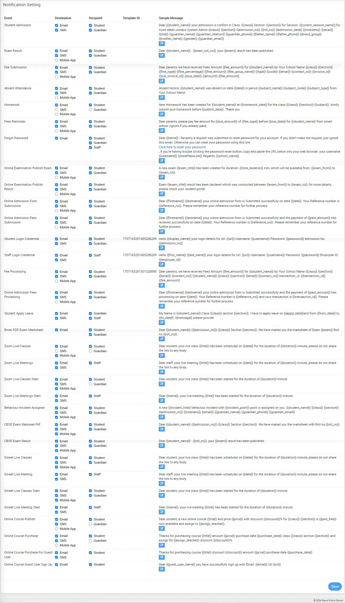 There are 29 events like Student Admission, Exam Result, Fee Submission, Absent Attendance, Homework, Fees Reminder, Forget Password, Online Examination Publish Exam, Online Examination Publish Result, Zoom Live Classes, Zoom Live Meetings, Gmeet Live Meeting, Gmeet Live Classes, Gmeet Live Meeting Start, Gmeet Live Classes Start, Zoom Live Classes Start, Zoom Live Meetings Start, Online Admission Form Submission, Online Admission Fess Submission, Online Course Publish, Online Course Purchase, Student Login Credential, Staff Login Credential, Fee Processing, Online Admission Fees Processing, Student Apply Leave, Email PDF Exam Mark sheet, Online Course Purchase For Guest User and Online Course Guest User Sign Up.