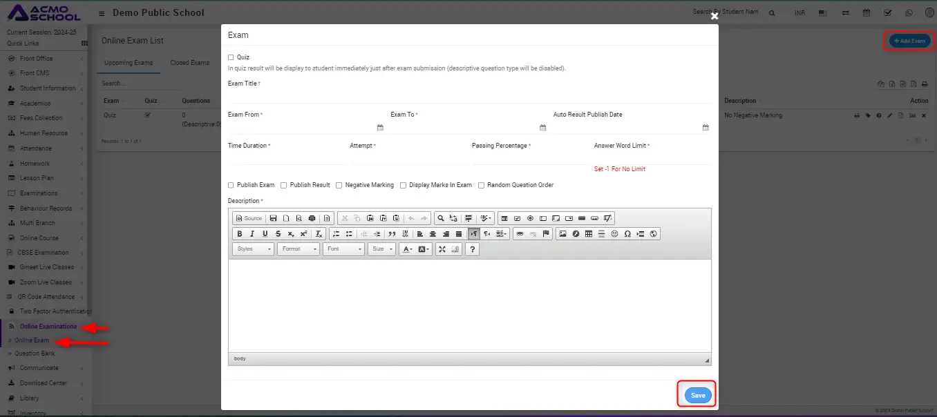 Then click on Add Exam button present at top right corner of the online exam list page, at click of this button Add Exam modal will be open.