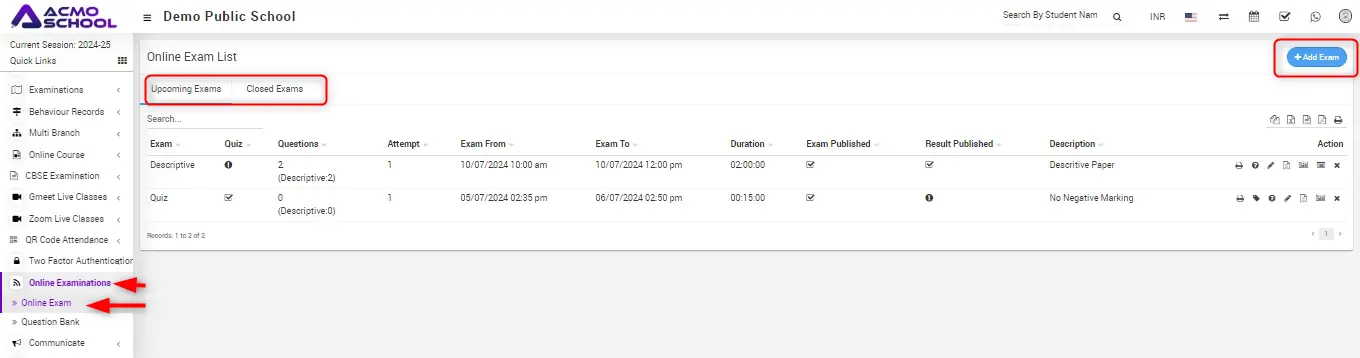 In Closed Exams, you can see those exam list whose exam dates are passed till the exam to set.
