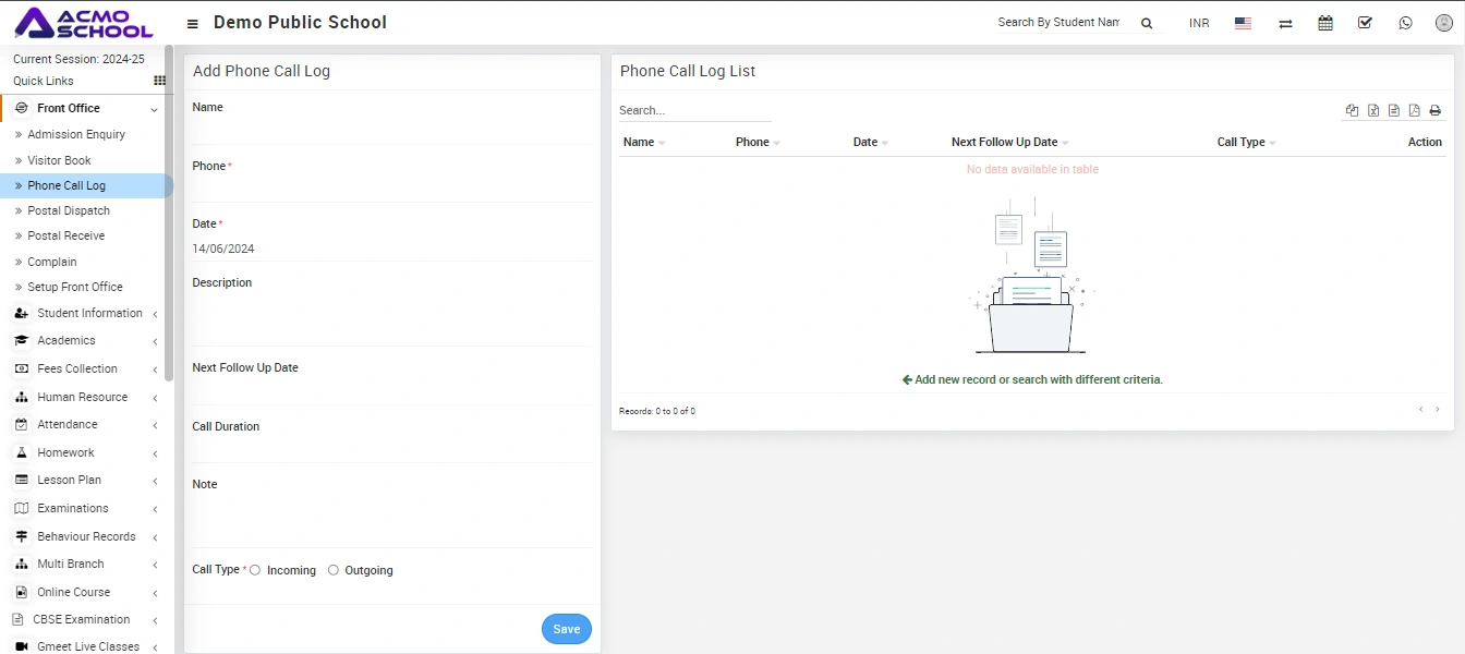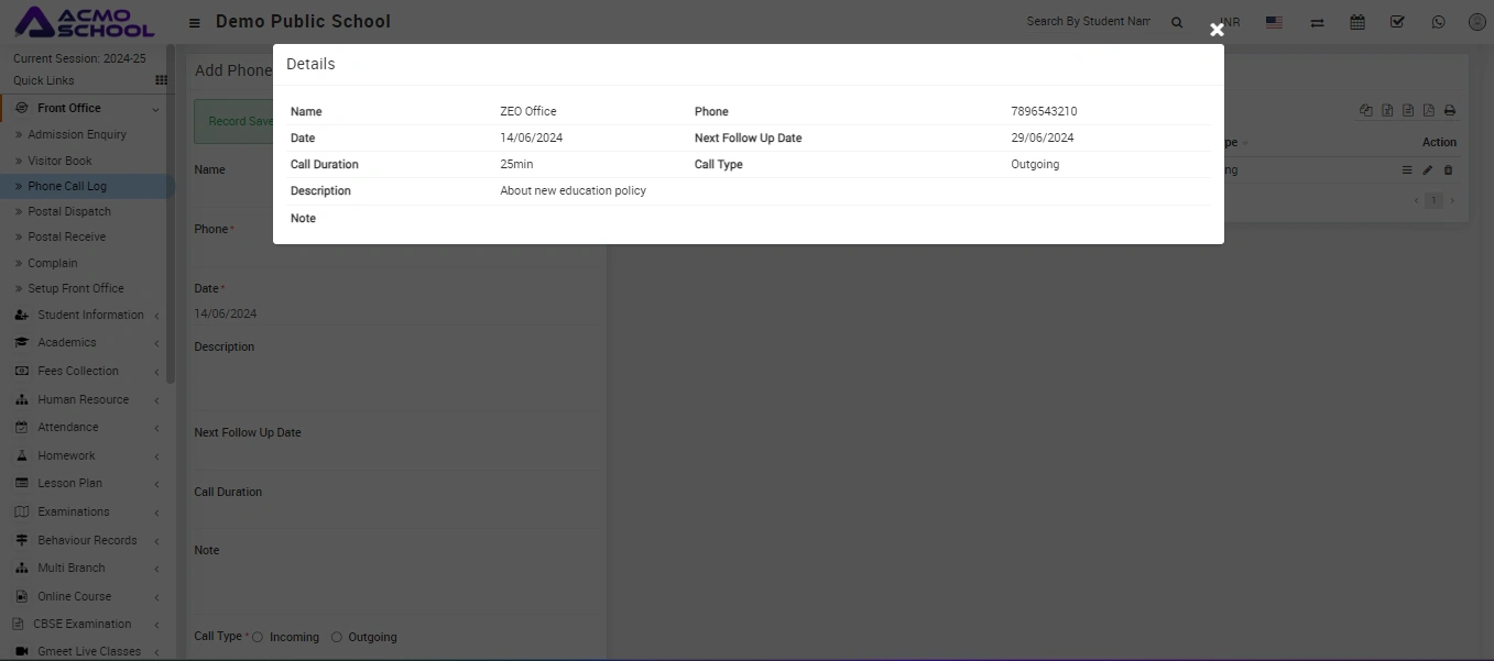 To add phone call log, go to Front Office > Phone Call Log then enter Name, phone, Date, Description, Next follow Up Date, Call Duration, Note and select Call Type (incoming/outgoing) and then click on the Save button.
