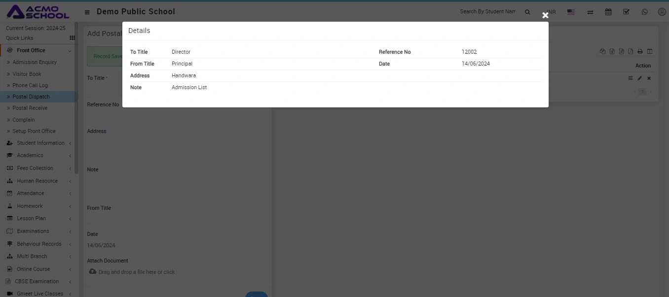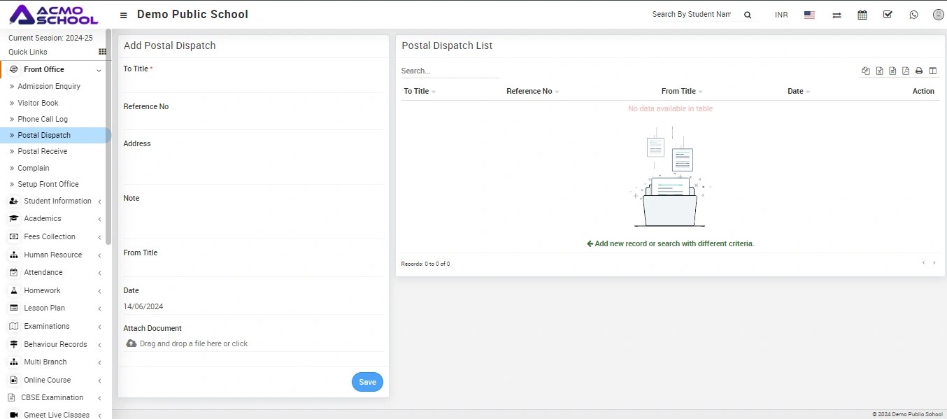 To add postal dispatch, go to Front Office > Postal Dispatch then enter To Title, Reference No, Address, Note and From Title, Date and Attach Document and then click on the Save button.