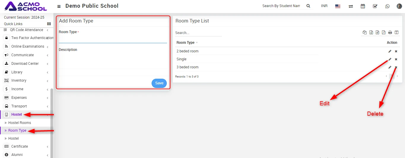 Go to Hostel > Room Type