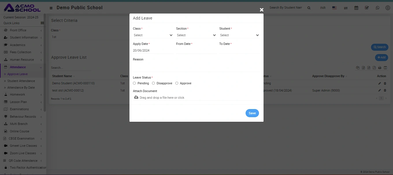 Here select Class, Section and Student and enter Apply Date, From Date, To Date, Reason, Leave Status (Pending, Disapprove, Approve) and Attach Document (if you want to attach any file) and then click on Save button. You can view this added record in the below of the page.