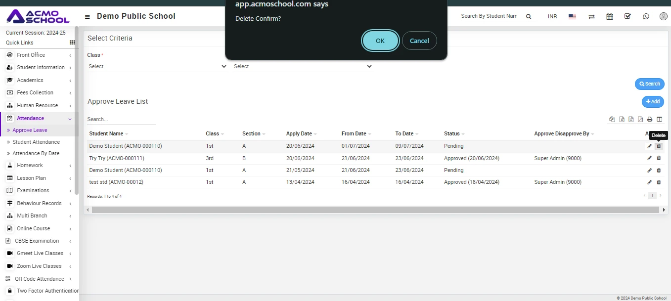 To delete the applied leave, click on the Delete icon present in the action column. When you click on it, a confirmation window for deleting appears.