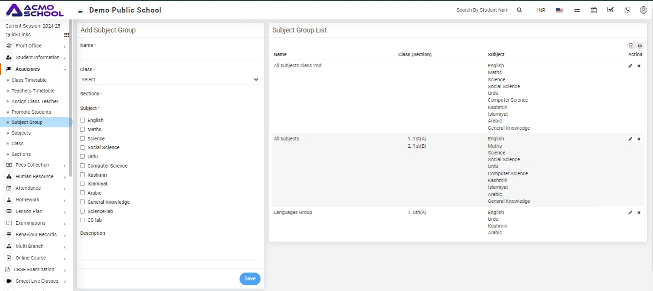 To add subject group, go to Academic > Subject Group then enter subject group Name then select Class, Section, Subjects and enter Description and then click on the Save button. You can view this added record in the Subject Group List on the right side of the page.