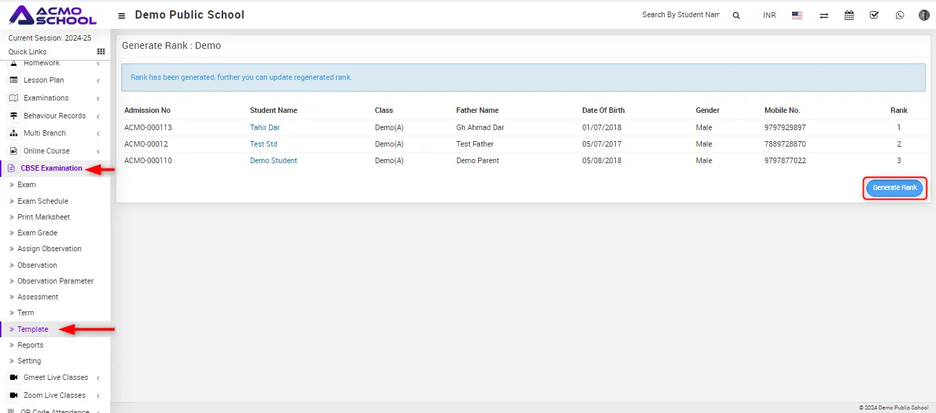 Initially, the rank column will be blank until you click on Generate Rank button.