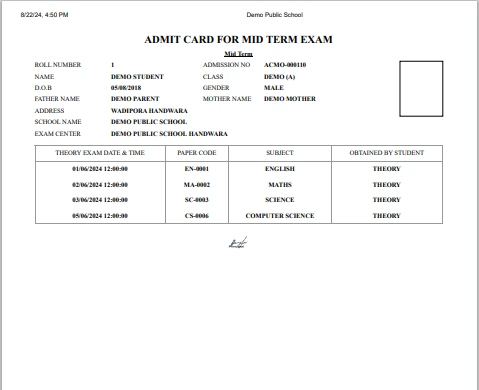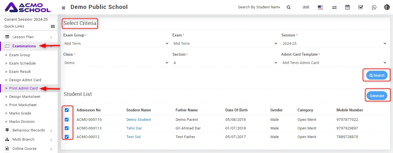 Now select student for generate admit card and click on the Generate button present at right side in the student list, at click of this button admit card will be open.