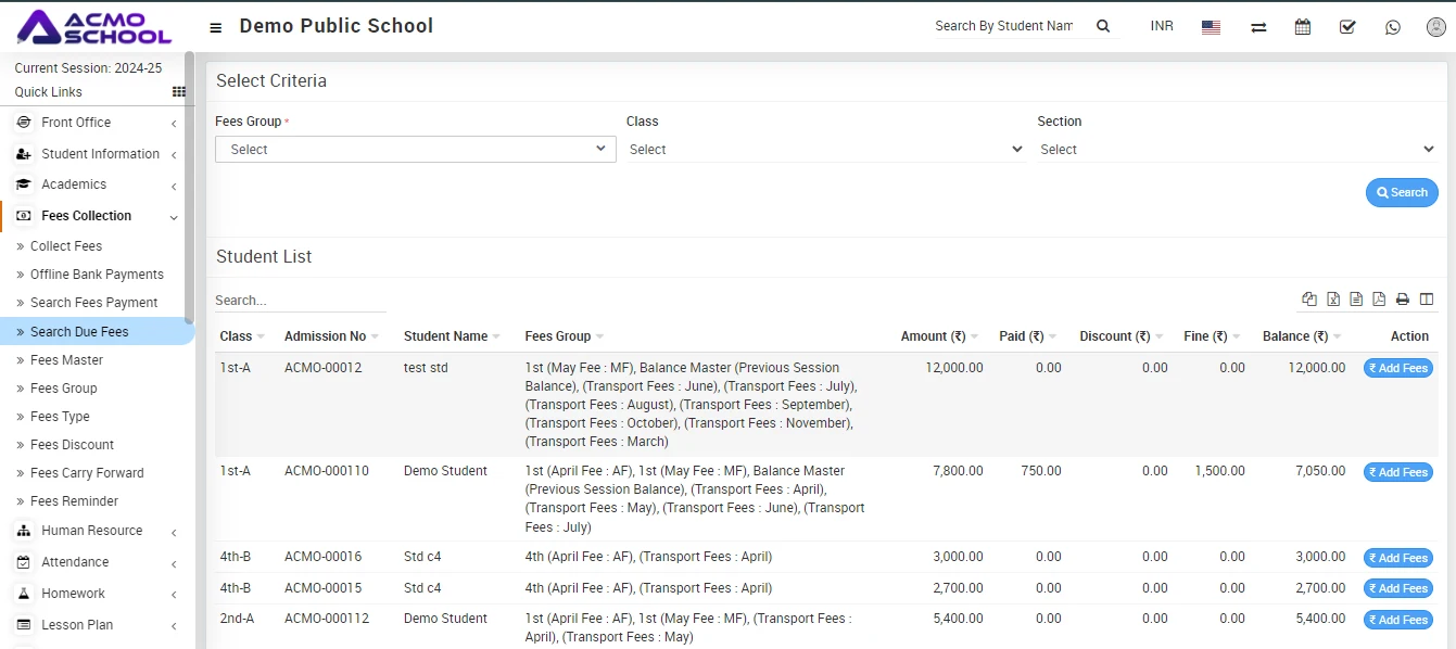 Here, you can see the list of students whose fees are due.