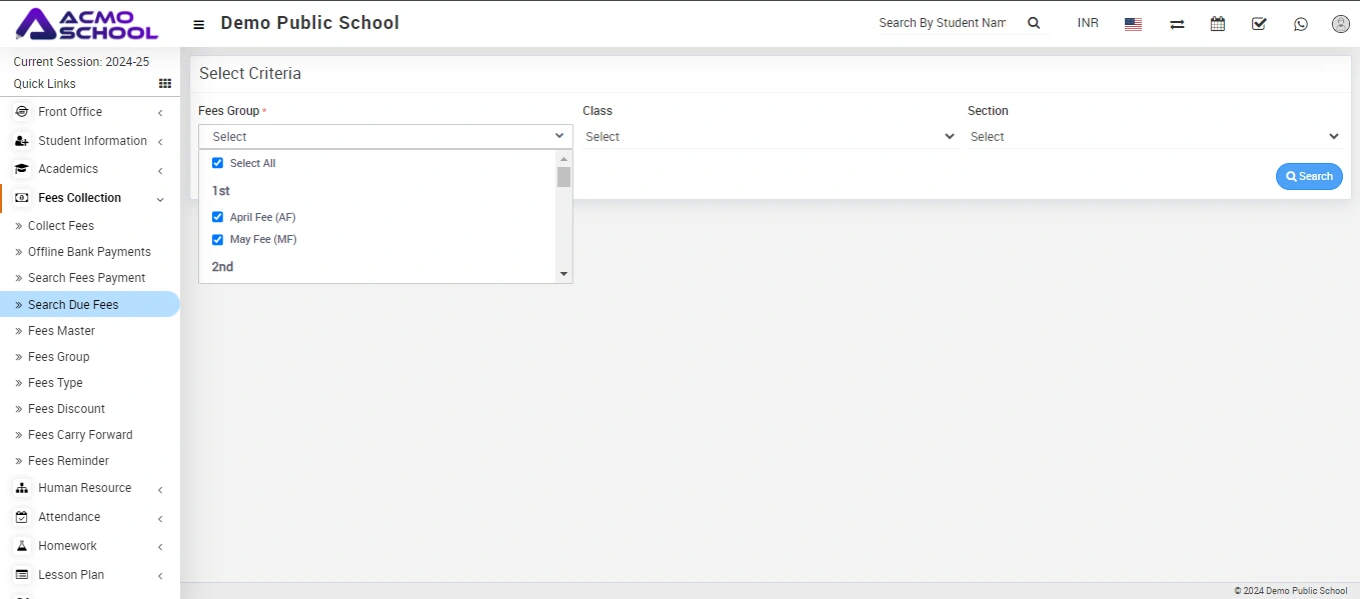 Go to Fees collection > Search Due Fees to look for overdue fees. You can select a single, multiple, or all fees group in Fees Group by checking the checkboxes next to the Balance Master, Admission Fees, Class Fees, Tuition Fees, and so on as available in your fees group, and then selecting the class, section, and clicking on the “Search” button.
