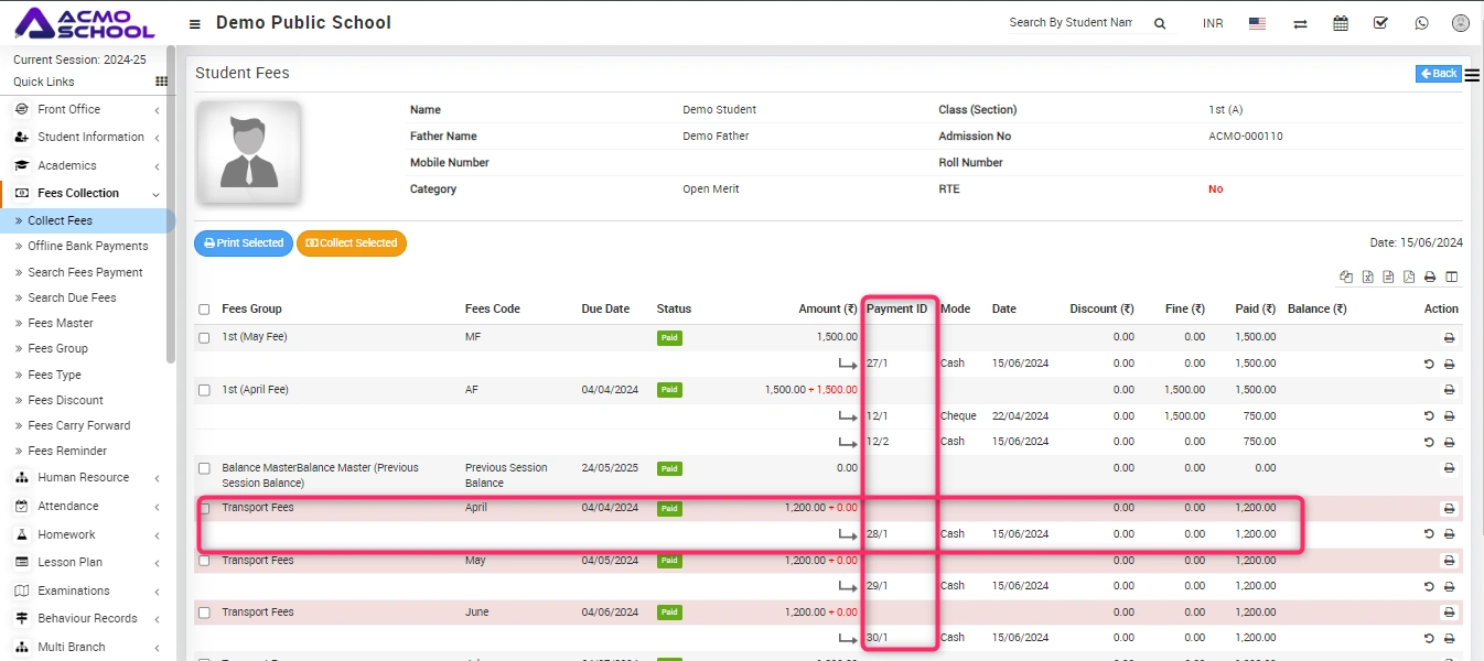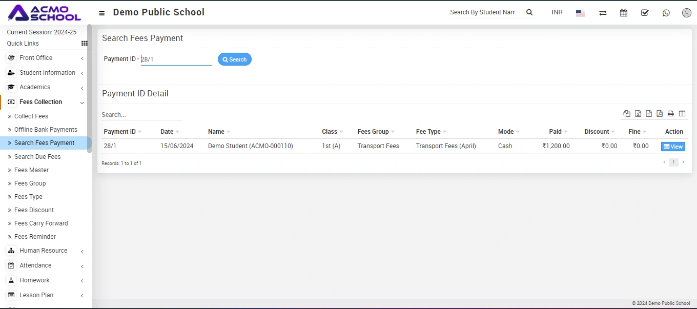 To search fees payment, go to Fees Collection > Search Fees Payment. You can search any fees payment detail through payment id and here enter Payment Id and then click on Search button. The list of payment detail will be shown in the below of the page.