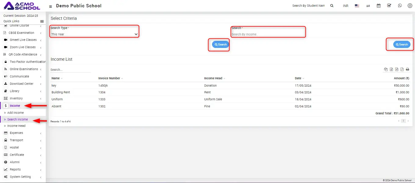 You can also search the record by income, for this enter the income title in the Search by Income textbox and then click on the Search button.