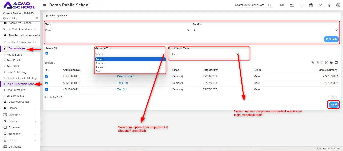 How to Send Login Credentials? Go to Communicate > Login Credentials Send and select Class, Section then click on Search button. Then student list with their details will appear. Now set the “message to” and “notification type” tab, select one option from dropdown list. Updated on July 9, 2024 Tagged: AdminSend Login Credentials Was this article helpful? Yes No Related Articles How to view Scheduled Email SMS Log? How to manage SMS Template? How to manage Email Template? How to Send SMS? How to view Email / SMS Log? How to Send Email?