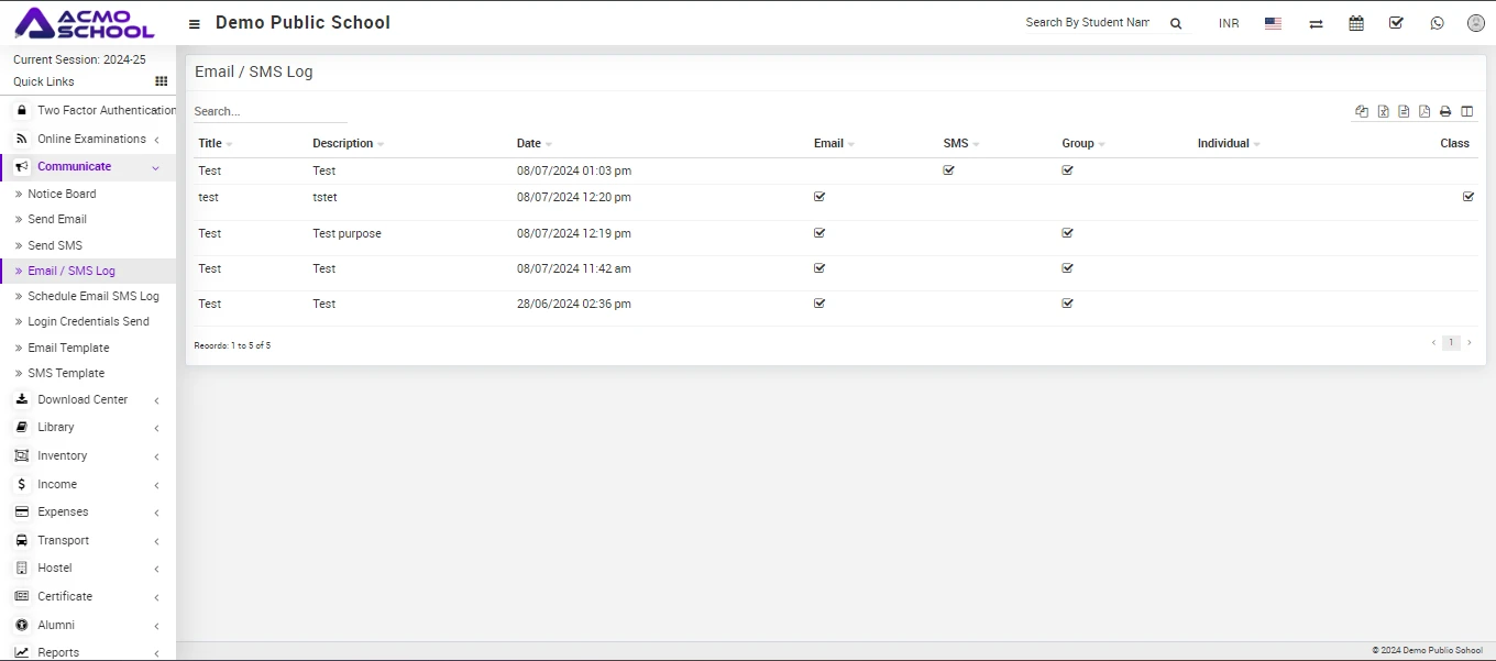 How to view Email / SMS Log? Go to Communicate > Email / SMS Log, here you can see all the sent Email/SMS. Updated on July 8, 2024 Tagged: AdminGuardiansStudentsTeacherView Email/SMS Was this article helpful? Yes No Related Articles How to view Scheduled Email SMS Log? How to Send Login Credentials? How to manage SMS Template? How to manage Email Template? How to Send SMS? How to Send Email?