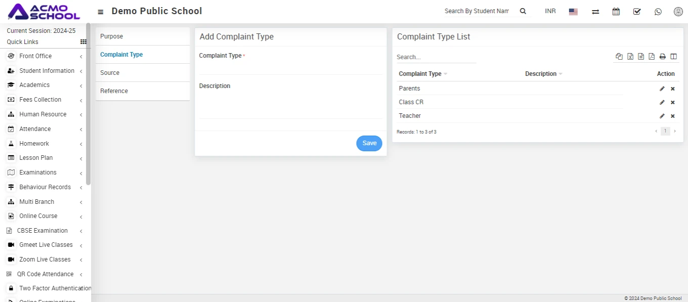 Follow same procedure to make entries for Complain Type, Source and Reference.