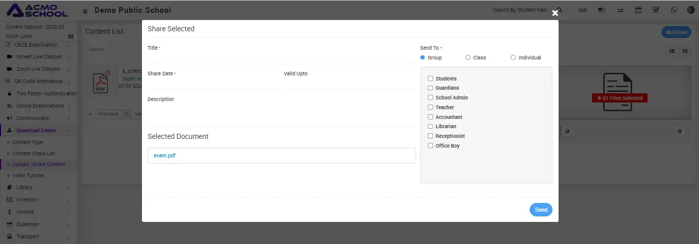 3. To share content, simply check the checkbox of the content or you can check the multiple content, at the same time and at the right side, you can see the count of selected files.